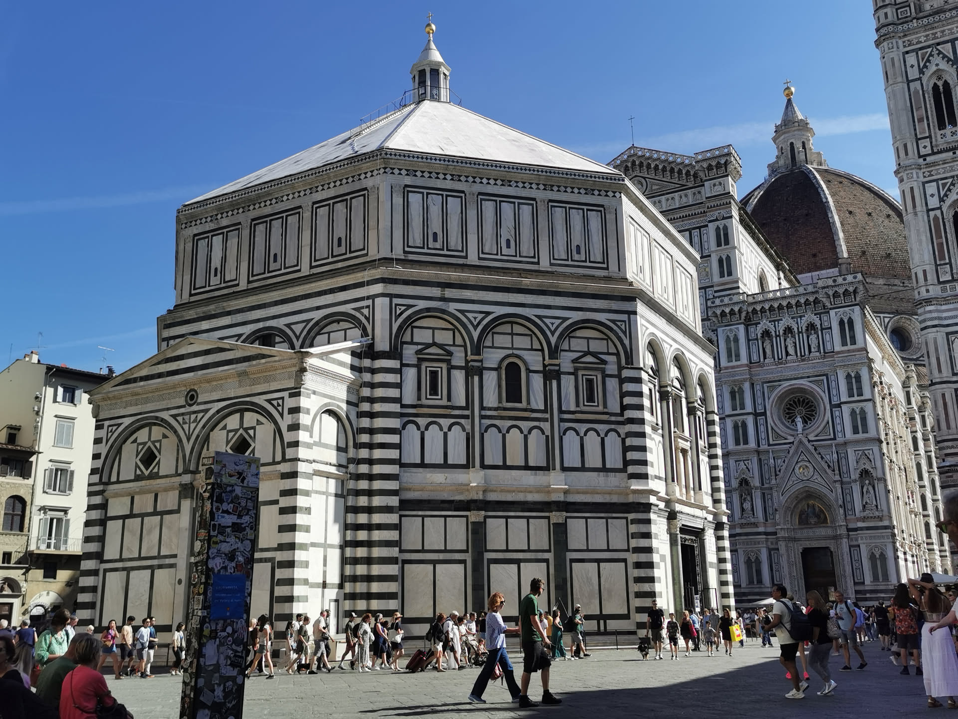 再度漫步领主广场,重温文艺氛围。造型独特的洗礼堂相邻于百花大教堂。